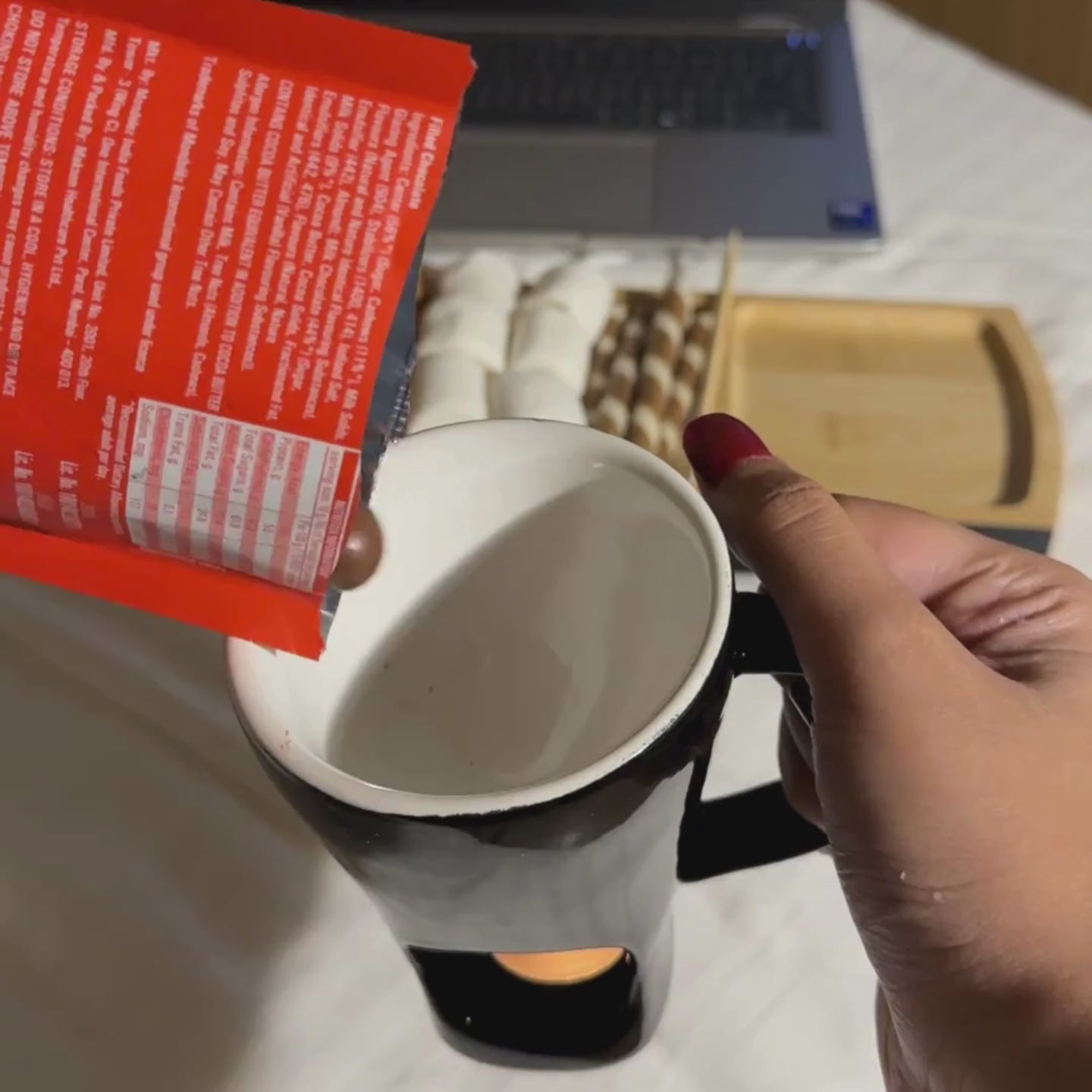 Place the candle in the base of the mug and light it. Add the chocolate callets, stir gently for 2–3 minutes until smooth, then dip and enjoy.